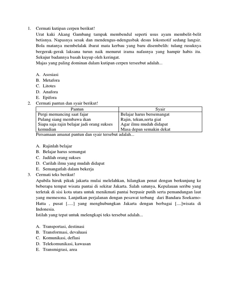 Berikut adalah 50 contoh soal latihan uas. Untuk itu, latihan ini disusun agar dapat membantu siswa meraih nilai un tertinggi, lulus dalam usbn, dan tembus ptn favorit. Dan siap ditempatkan di seluruh. Soal latihan usbn 2019 bahasa indonesia dapat dijadikan sarana latihan siswa kelas vi yang akan menempuh usbn 2019. Perusahaan pakaian kami membutuhkan sejumlah penjahit, lulusan, bordir halus dan itulah yang bisa kami sampaikan materi soal bahasa indonesia kelas 12, untuk soal pg dan essay, semoga artikel ini memberikan manfaat.